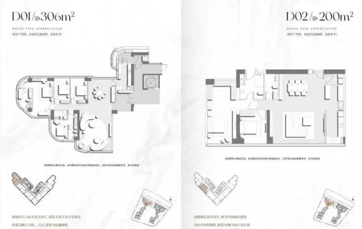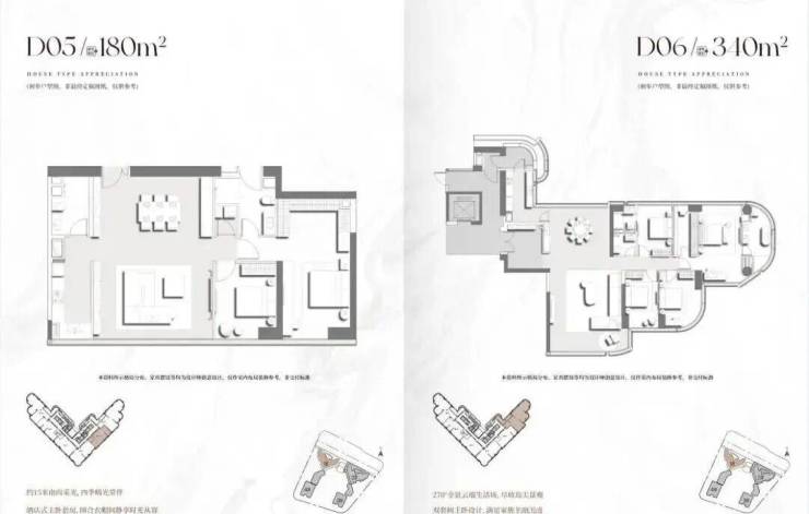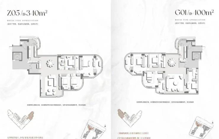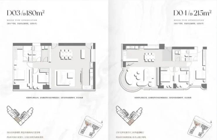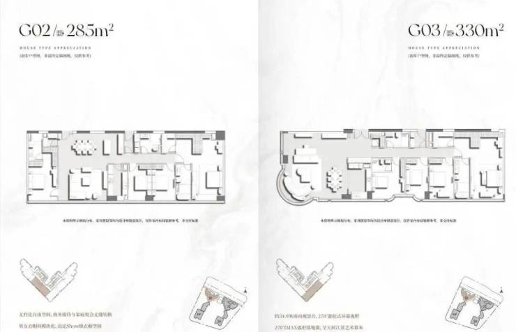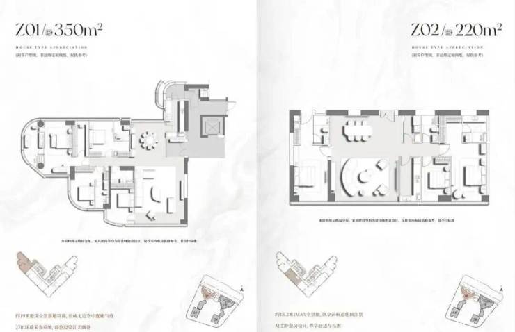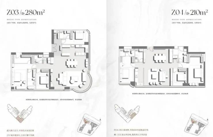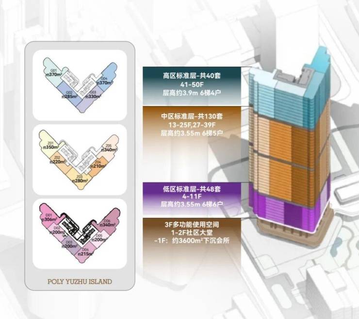 项目首推2栋建面200-400㎡南向一线临江大平层,项目主推户型层高达3.5-3.9米,低区户型层高3.5米,打造通透立体空间;高区户型层高3.9米,结合挑高客厅设计,营造“空中别墅”般的体验。住宅4层起,户型分布,分成低区、中区、高区。 中区是6梯5户设计,户型为210㎡、220㎡、280㎡、340㎡、350㎡。 高区是6梯4户设计,户型是285㎡、330㎡、400㎡。