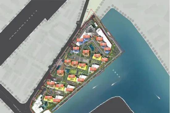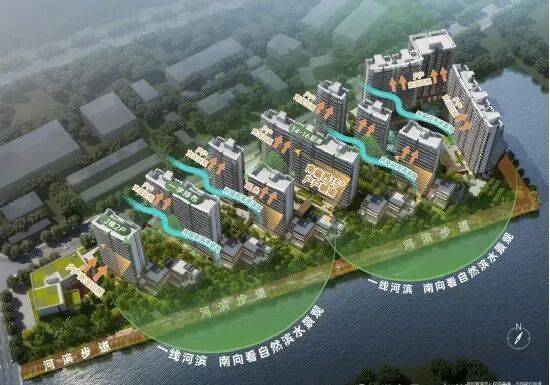 产品主要以小高层和叠墅为主,其中16栋为14-16层的小高层住宅,5栋临河的4层叠墅。由于临近军区的原因,所以朝向不是正南,而是偏西南,小区设计南低北高,东侧的临河位置由于限高15米,做了5栋4层高叠墅,西侧也是小高层15-16层设计。