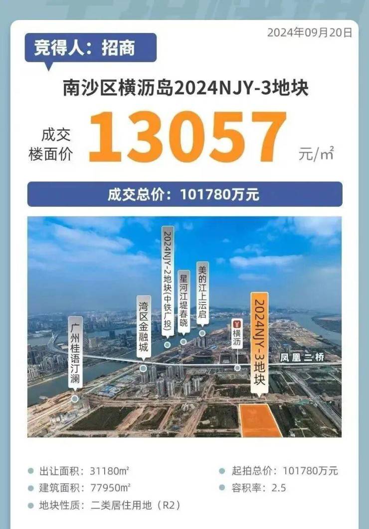 2024年9月20日,广州招盛房地产有限责任公司(招商蛇口)以底价10.18亿元拿下横沥岛2024NJY-3地块,扣除456㎡配建后,成交楼面价约1.3万/㎡。