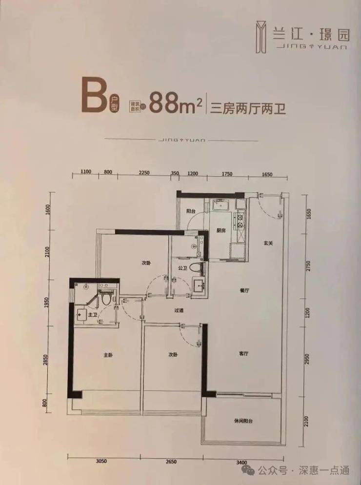 88m²的3房2厅2卫,设计的经典竖厅格局,进门入户玄关,客厅3.4米开间,LDKB一体化设计,三开间朝南,动静分区,分别做到了主卧10.98m²/次卧9.3m²/次卧6.49m²(实测面积,去掉墙体),L型厨房带1个小生活阳台1.92m²,卫生间干湿分离,得房率78.8%(不含赠送),客厅阳台7.14平东南朝向,看小区园林或比亚迪+山景。套内面积68.73m²+飘窗6.24m²+阳台4.53m²=实际套内79.5m²,加上赠送面积后得房率约90.62%。