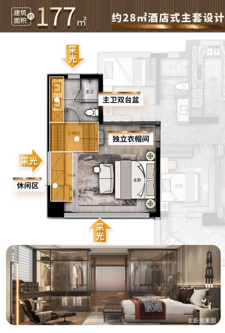 建面约28㎡的奢阔主套,步入式衣帽间、卫浴自带双台盆,是星级酒店总统套房的同款享受。