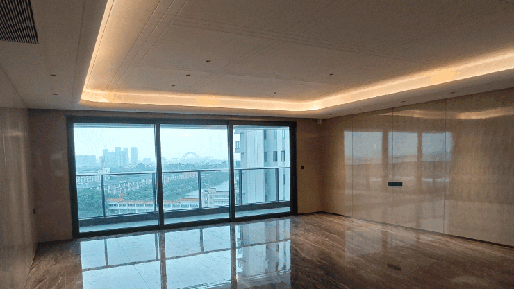这种近乎奢侈的用材用料,被同步到了湖光悦色的室内交标中。除200平顶豪户型外,其余户型一律标配花纹连贯的岩板背景墙,同时,地面铺装、玻璃分隔,全部使用大块面切分。