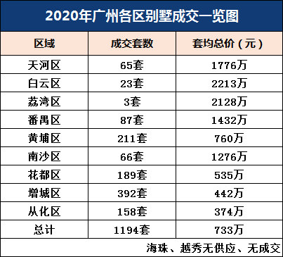 克尔瑞数据显示,2020年广州中心六区的别墅成交均价至少1700万+;就连稍微外围一点的区域,番禺、南沙售价基本也已接近中心区,达到了1200万以上。而黄埔的成交均价也去到了700万+。