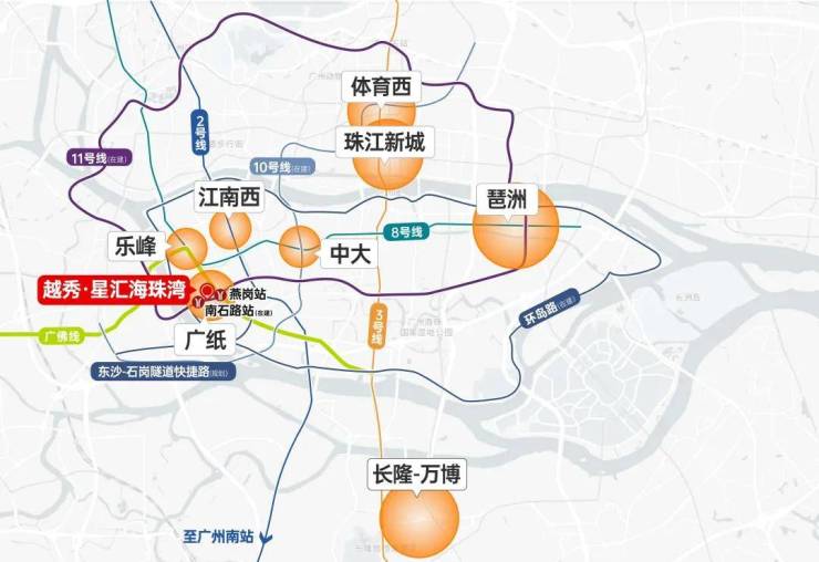 广佛线燕岗站,接驳广佛百万客流;环城线11号线(在建中)横跨海珠、天河、越秀、白云和荔湾五大主城区,连接广州火车站、广州东站等大型交通枢纽,发展价值无可限量。