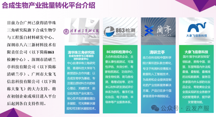 依托 “合成生物产业批量转化平台” ,力合科创 联合清华珠三角研究院、863材料检测中心、清研兰亭、大象飞等顶尖机构 ,为企业提供从技术研发、检测认证、数字化管理、产业资源对接到基金投资的全周期赋能,真正实现“空间+服务+生态”的深度融合,让企业专注创新,稳健成长。