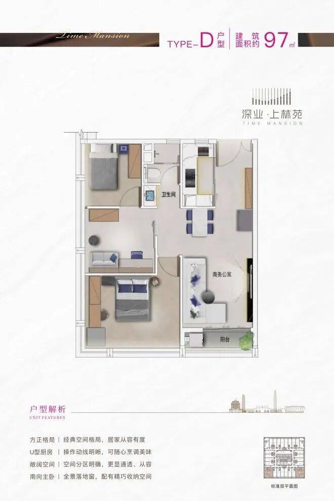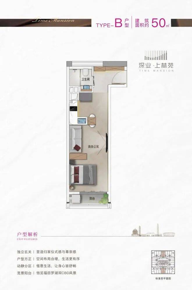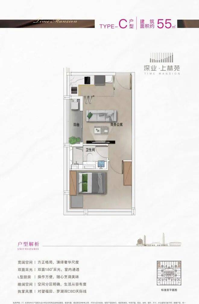 本次推售建面约40-97㎡新品单位,位于32—36F高区楼层,以约3.6米层高,打造都市菁英居住或工作的理想1-3房。户户均带阳台,尽揽福田天际线之繁华,坐赏公园自然之写意。现代简约设计风格,全屋配备品牌家私家电,极致的空间布局,强大的收纳空间,让每一位置身其中的业主都感受到云端菁英的圈层臻享。