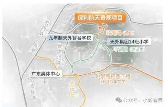 项目坐落于天河智谷奥体世界大观板块,西北毗邻保利天汇,南侧紧邻缦云广州、越秀观樾等高端项目,跻身天河核心居住圈,承接广州“东进”战略与天河智谷科创发展红利[4]。作为天河重点发展的产城融合板块,天河智谷汇聚大量科创企业与高端就业人群,周边50+老旧社区积压大量高端改善需求,项目的入市精准填补板块低密湖居产品缺口,供需优势凸显[3][4]。