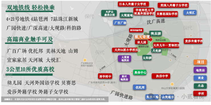 义务教育阶段,项目学位由广州市天河外国语学校智谷学校统筹解决,该校教学实力雄厚,依托优质师资与教学资源,为孩子提供高质量教育[4]。周边还分布多所优质中小学,高校氛围浓厚,为孩子营造良好的成长环境,兼顾学识提升与综合素养培育,适配刚需改善家庭对教育的核心诉求[4]。