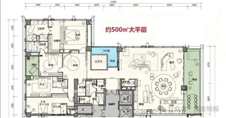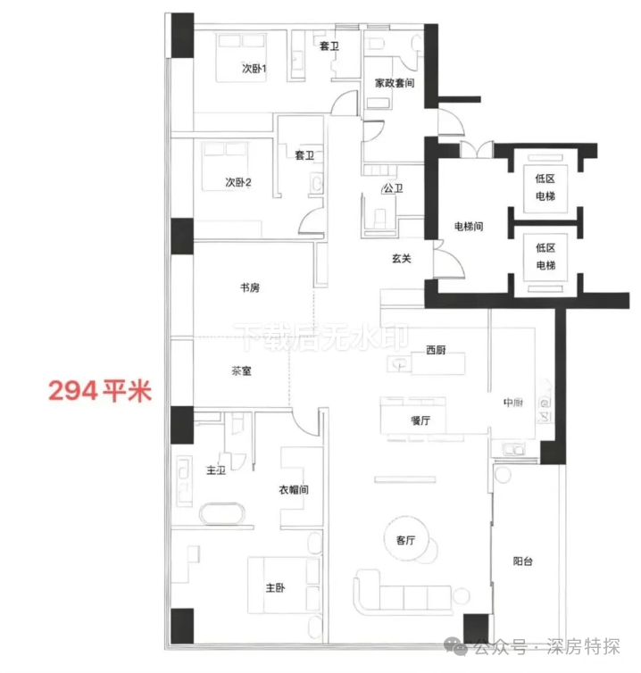 · 269-294㎡户型: 通常是四房以上大户型,注重家庭互动空间与个人私密空间的结合。