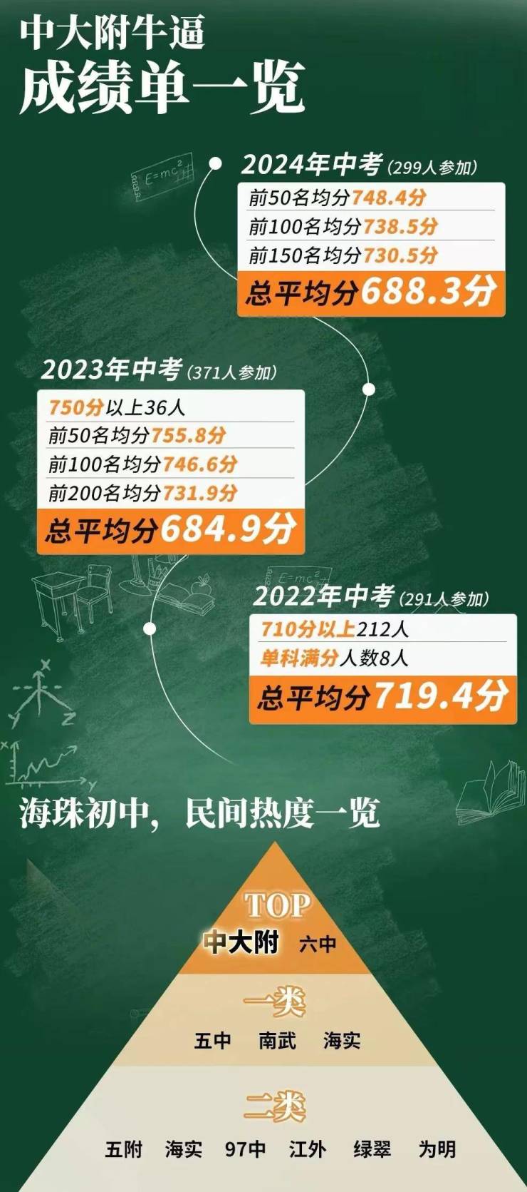 据坊间数据,24年中考,中大附(299人参加中考),前50名均分748.4分。