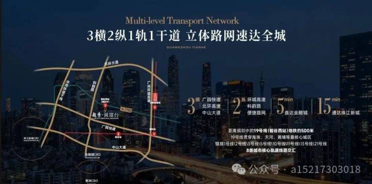 •3横2纵主干道,速通珠金琶,北环高速+广园快速+中山大道/环城高速+科韵路