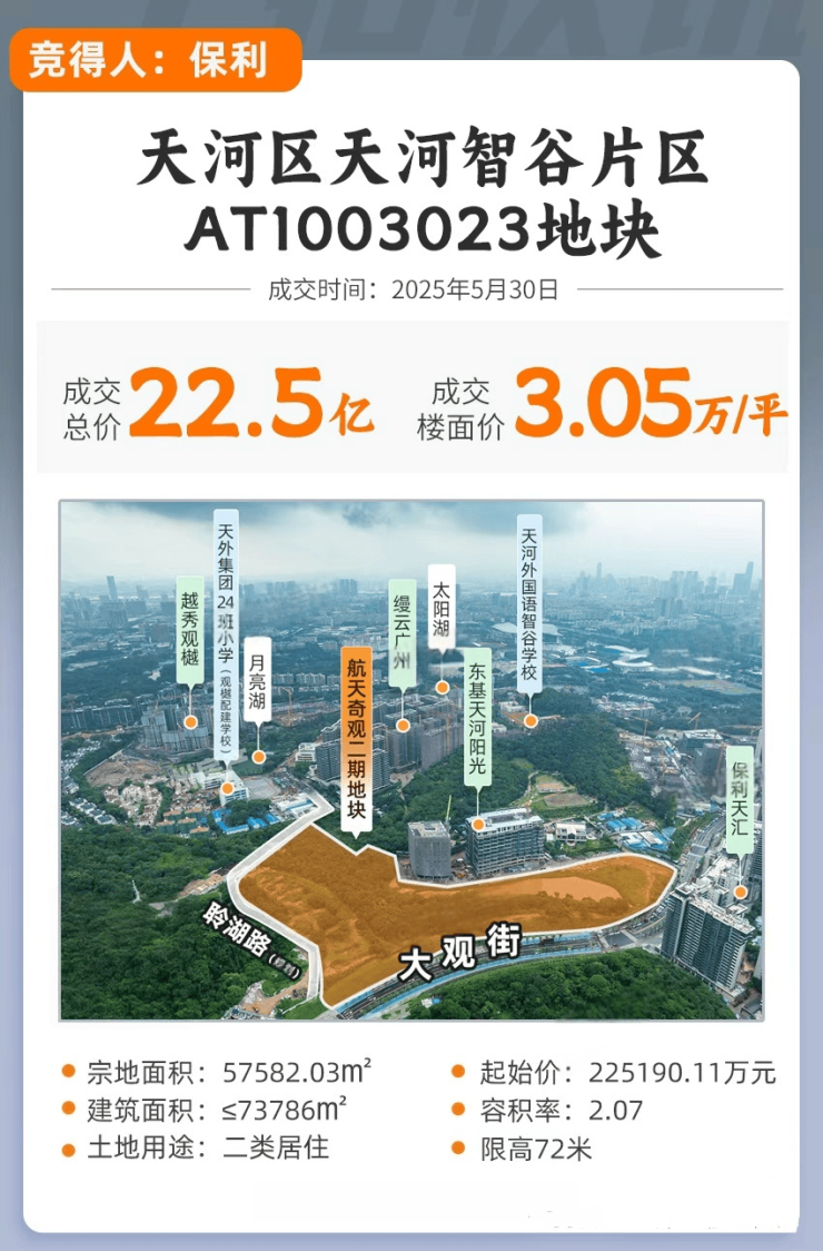 2025年5月30号,保利发展以22.5亿总价拿下天河航天奇观二期(智谷片区AT1003023地块),名义楼面价约为3.05万元/平。