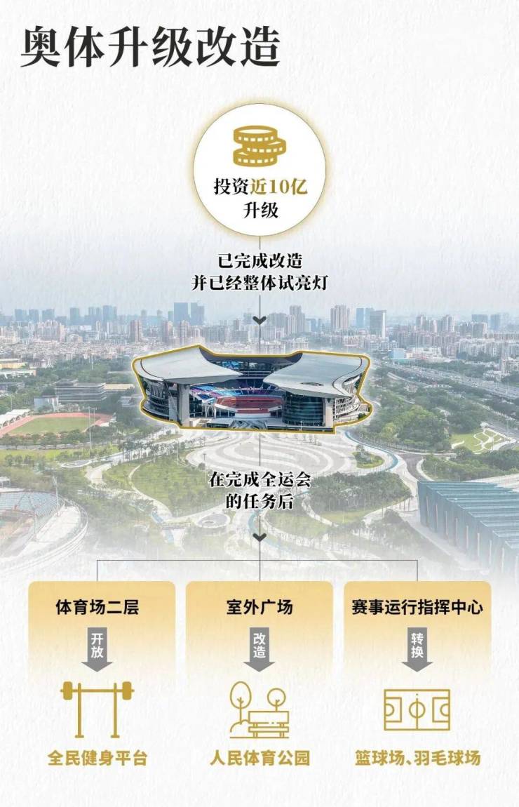 10亿升级的广东奥体中心,已完成改造,并已经整体试亮灯。在完成全运会的任务后,其体育场二层会开放为全民健身平台,室外广场会改造为人民的体育公园,赛事运行指挥中心将动态转换为篮球场、羽毛球场等。