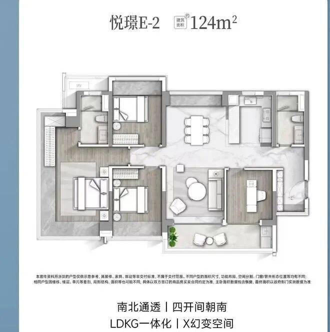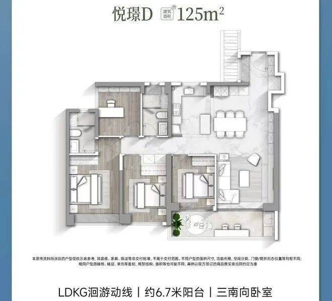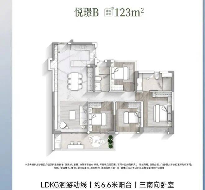 一期悦璟D户型 建筑面积约123㎡,四房两卫,四开间南向,约6.7米阳台。