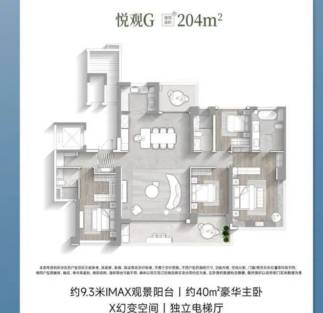 一期悦观G户型,建筑面积约206㎡,大四房,LDKG一体化设计,同享约9.3米南向IMAX观景阳台约40㎡豪华主卧套房。