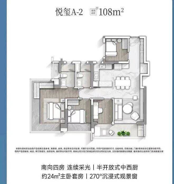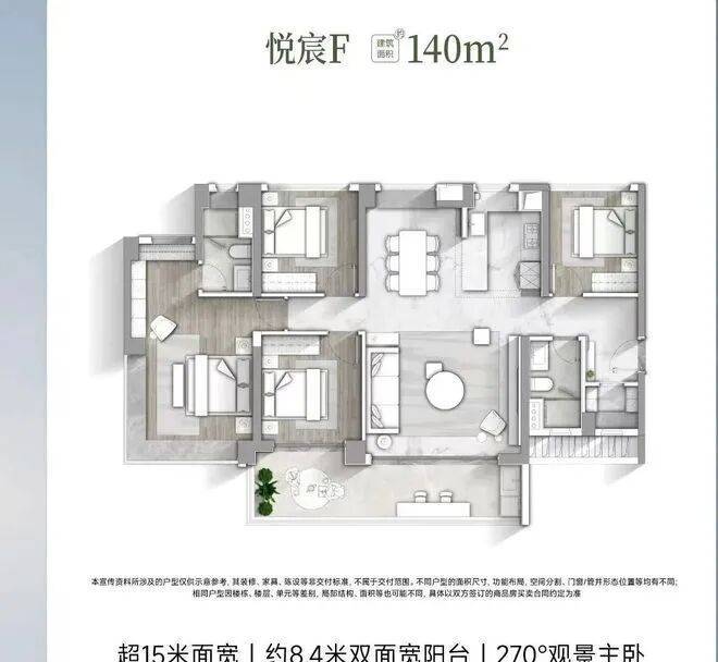 一期悦宸F户型 建筑面积约140㎡,南北对流大四房,三面窗270°采光,约8.4米双面宽阔景阳台。