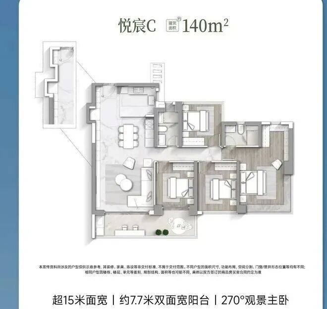 一期悦宸C户型 建筑面积约140㎡】超15米户型展宽,四开间朝南,约7.7米双面宽阔景阳台。