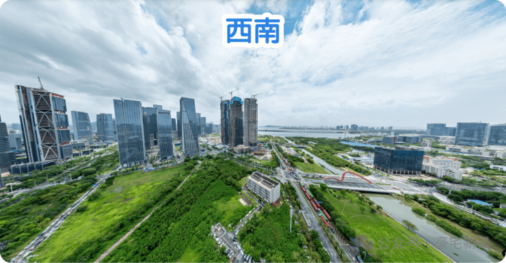 东北:楼下近距是公园绿地和双界河东段景观,远处看新安老城方向,整体远景城市景观为主。