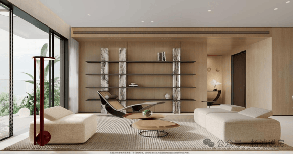 客厅空间全屋搭载大金中央空调系统,实现快速制冷制热与精准温控;顶部采用极简风格环形吊顶,地面铺贴冠珠大板瓷砖,并以密缝工艺打造整体统一的视觉效果,于简约基调中自然流露轻奢气质。