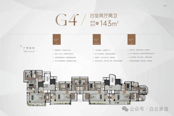 产品方面:目前处于清盘阶段,全盘皆为143㎡,包括改善型四房大平层,两梯两户板楼设计,143㎡(实用280-450㎡)叠墅,产品皆属顶尖改善型,户型产品力属全白白云区顶尖品质,单论产品力足以跟龙湖天奕/粤海云港城以及云和墅做对比,该盘密度极低绿化率高产品属于高端改善型产品;