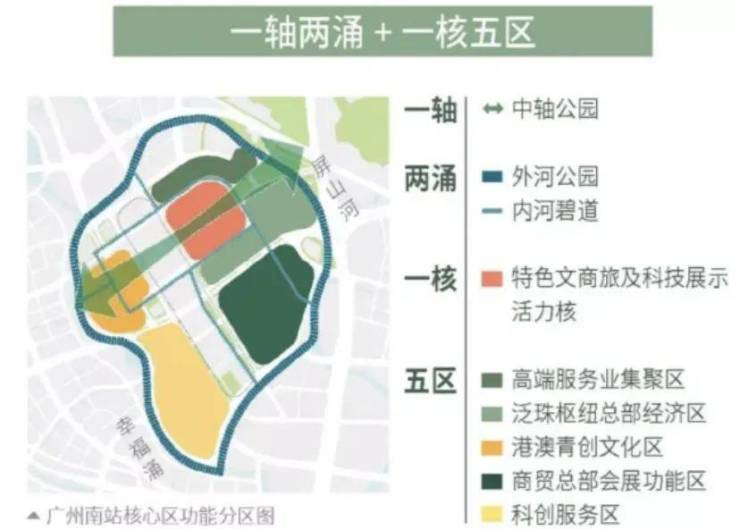 南站核心区总占地面积约4平方公里,相当于4个珠江新城。空间布局分为“一轴两涌+一核五区”。