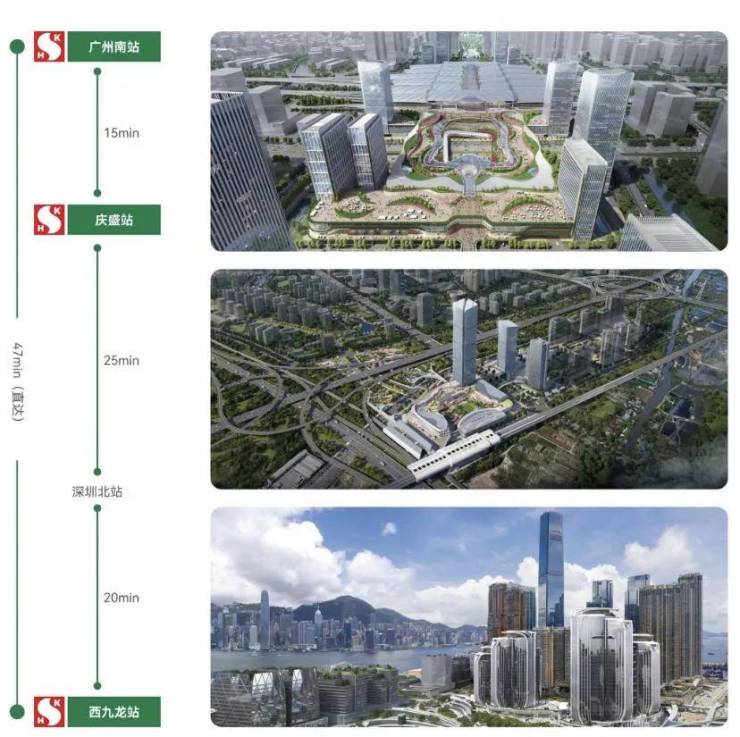 广深港高铁上汇聚新鸿三大TOD地标巨作(南站ICC-庆盛枢纽TOD-西九龙高铁站上盖发展项目),一轨之上港穗互联,比肩世界,总投资额高达近千亿。