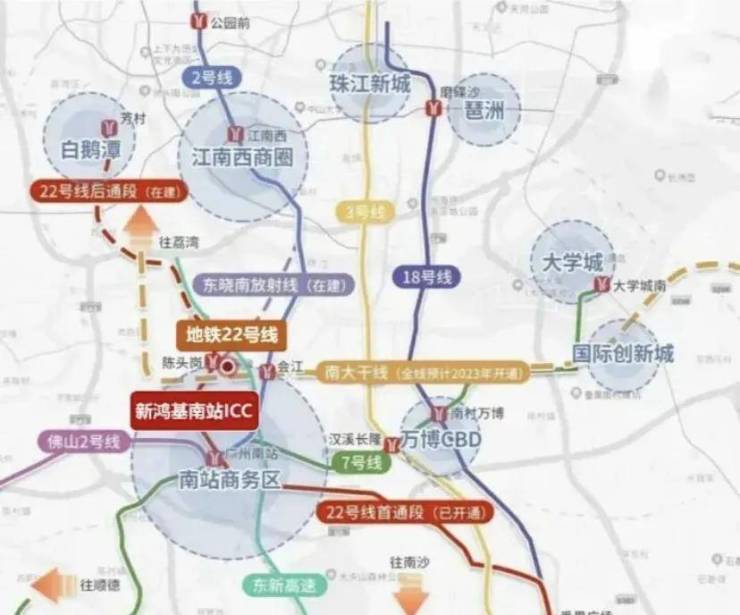 🚝南站连续多年蝉联全国火车站年客流量第一,发客量达1.88亿人次,享12条轨道交通,4高铁+4城际+4地铁无缝链接大湾区及国内9省,中转接驳东南亚10国,尤其通过广深港高铁可47分钟直达香港西九龙ICC,实现互联互通。另外,已开通广州地铁2号、7号、22号线和佛山地铁2号线。项目距离广州地铁2号线广州南站仅600米。