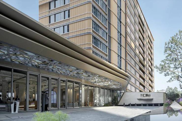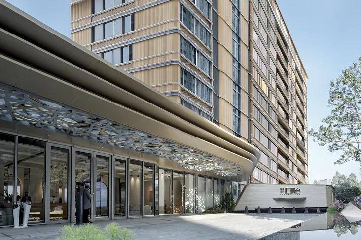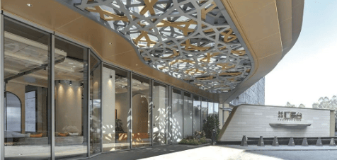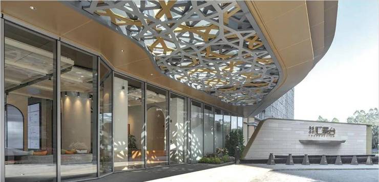 公建化立面,包括全景式系统玻璃门窗、铝板、陶板幕墙系统还有圆角造型。