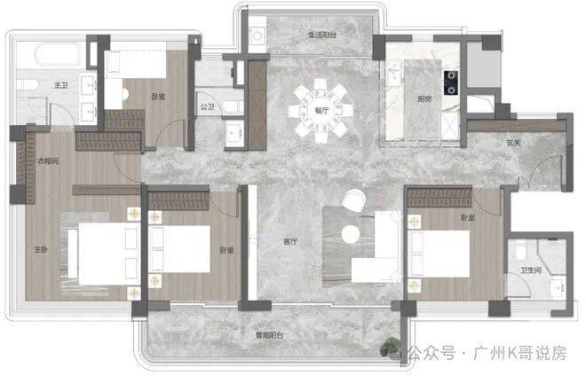先来看95㎡的户型,南向三房设计,客餐厅和阳台开间去到5.6米,也可改四房,主卧套房设计,带270°大飘窗。