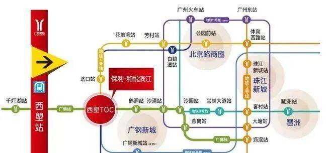 便捷交通网络:项目距离西塱站直线距离约 800 米,步行约 10 分钟可达。西塱站为 4 线交汇站点,汇聚 1 号线、广佛线、10 号线(预计今年开通)和 22 号线(预计今年开通),是广州主城区唯一四轨道交汇的地铁站,且地铁配套兑现速度快,为居民出行提供极大便利。