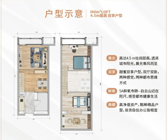 在产品设计上,广垦天河1号区别于传统单一公寓模式,推出31-57㎡灵活户型,层高涵盖3.4米、3.6米与4.5米,为业主创造了多维度的空间可能。尤其是4.5米挑高复式户型,可实现上下分层的多功能布局,既可自住,也具备办公与投资属性,充分满足新一代都市人群的多元化需求。