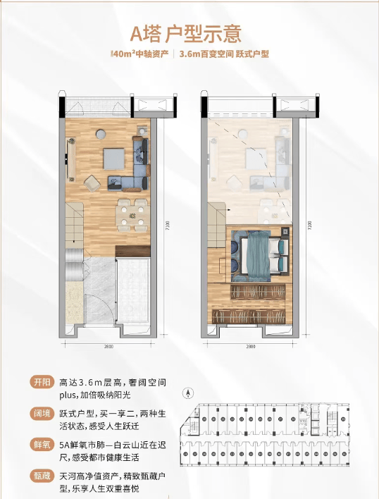 观成大楼:推售建筑面积约为31-57㎡的中轴资产,空间设计合理,包括卧室、厨房、卫生间等功能区域。4.5米高超高空间,采用中空挑高设计,提供墅级享受。