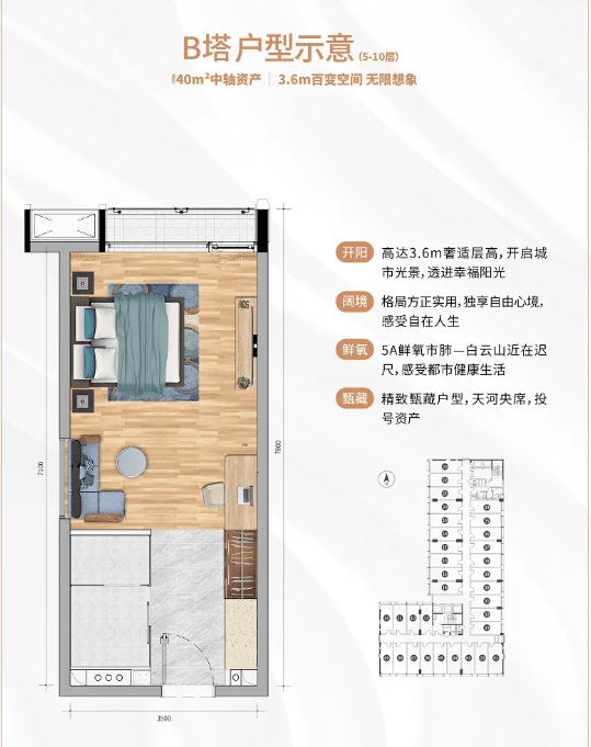 观云大厦:推售建筑面积约为36-43㎡酒店行政公馆和31-54㎡中轴精品空间,空间高度为3.4-3.6米,满足自用、办公、投资多重需求。