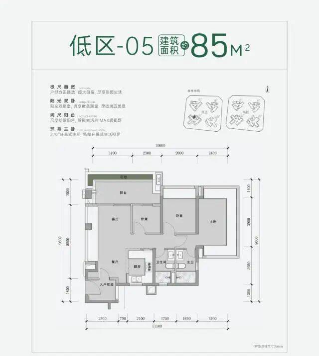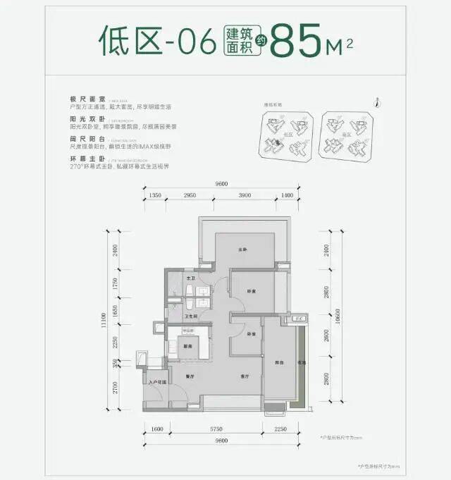 户型:建面74/85/96/115/129/143㎡,主打高使用率(近120%),74㎡做紧凑三房,85㎡三开间朝南,143㎡双阳台