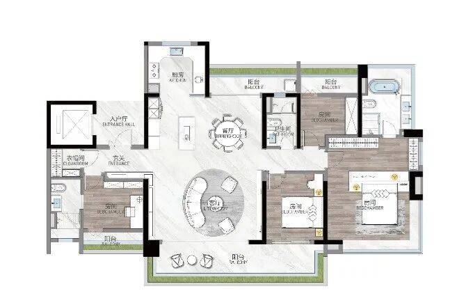 建面约115㎡四房户型,带有独立入户玄关,公共卫生间也设置在入户处,每天回家第一件事就能清洁消毒,将灰尘与细菌隔绝于室内。