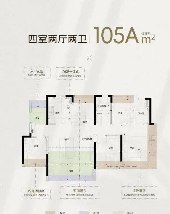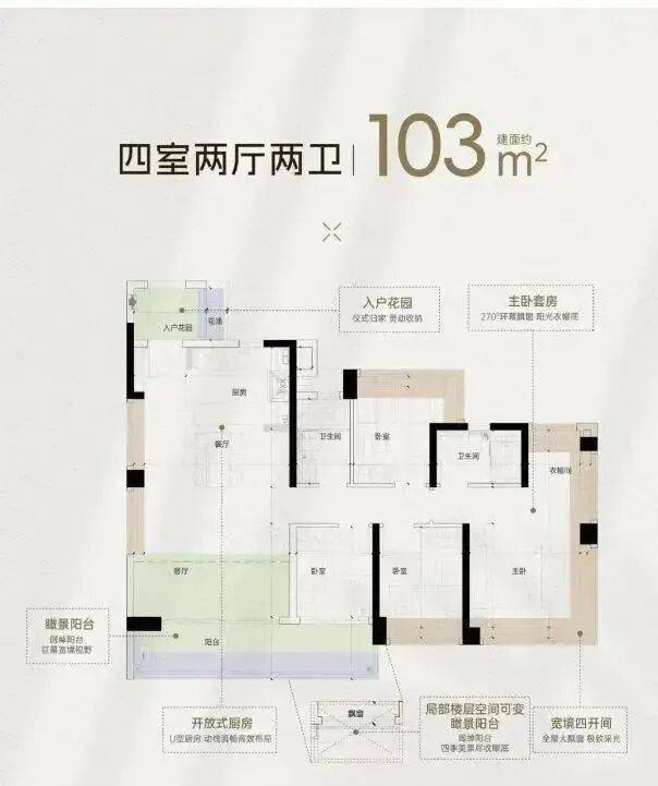 约103平方米户型:四房两厅两卫,独立入户花园,约7米通铺阳台,270°全景采光大主卧。
