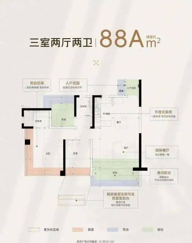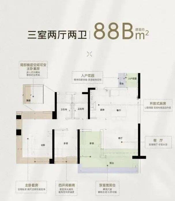 约88平方米B户型:南向三房两厅两卫,主卧270°飘窗可做创意功能区,中西厨分离,7.3米通铺阳台。
