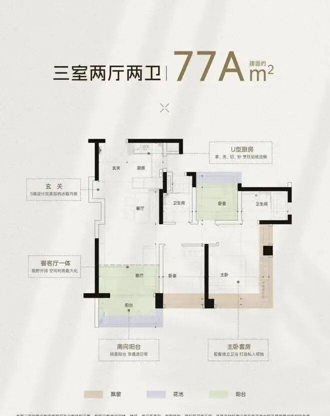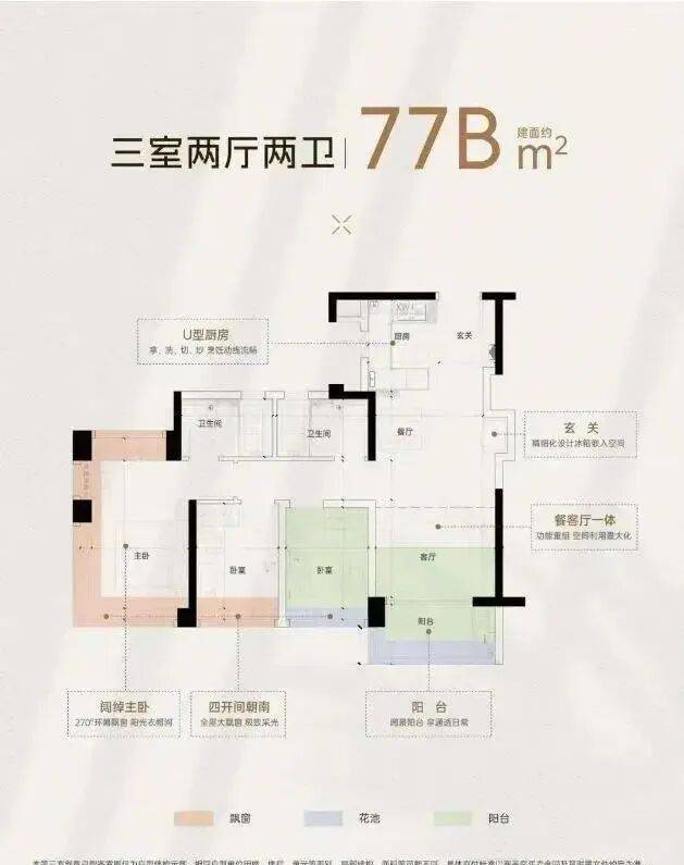 约77平方米A户型:三房两厅两卫,三面宽南向,LDKB一体化客厅与可变空间,适合小家庭。