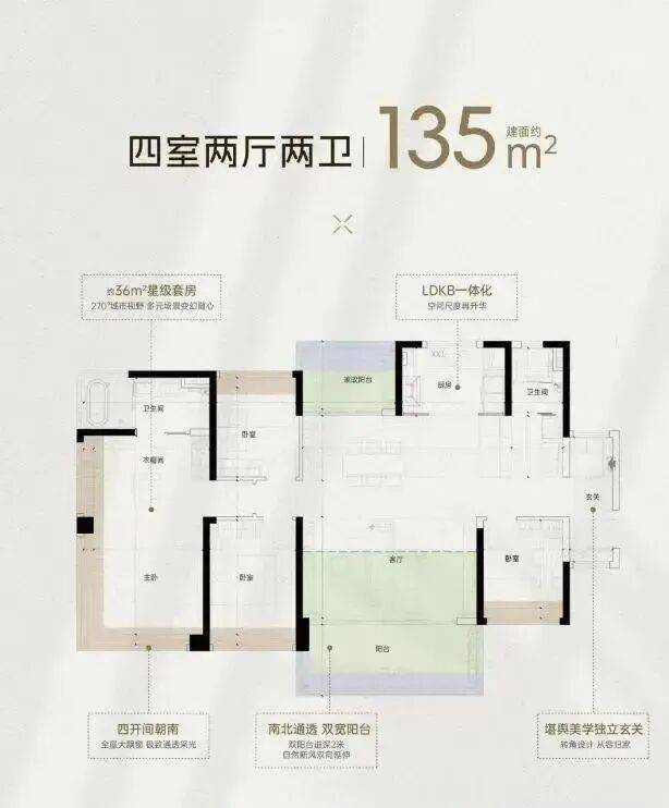 约135平方米户型:四房两厅两卫,南北通透双阳台,约5.25米大宽厅和约5.45米大阳台,宽敞舒适。