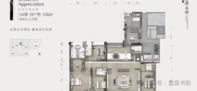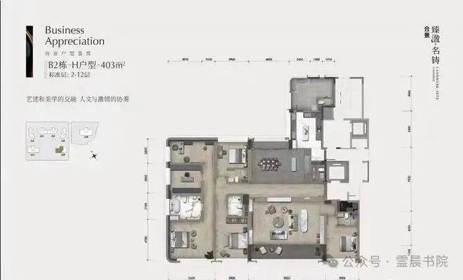 约 280 平四房格局非常规格,每个空间独立设计,对开发商的产品打磨能力有一定考验。建面322-403㎡南向大平层、头排江景