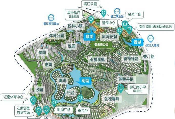 项目邀请国际顶级设计团队进行规划设计,在规划上保留了大量的原生态资源。斥资20 亿重金打造“1 江 3 湖 4 公园”的大园林景观:10 里的北江景观资源,三大原生态湖泊,邻近销售中心的 2.8 万㎡景湖;紧邻江南汇酒店 2 万㎡的翠湖;还有面积最大 21 万㎡的明湖;围绕明湖,还建有一个明湖公园,里面有一条 3 公里的环湖自行车道。