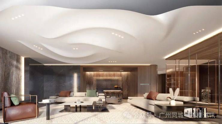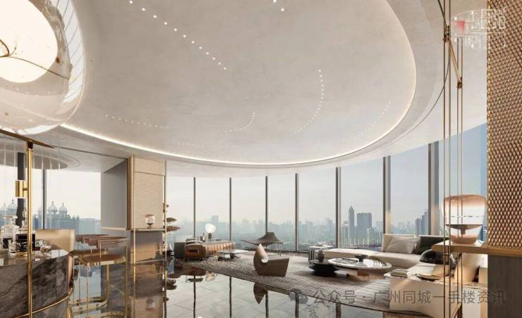 全中空low-e静音玻璃幕墙和曲面建筑设计,勾勒出与珠江水呼应的泼纹曲线。光、水、空间,彰显品风临江大宅风范,空间处处彰显高定美学。