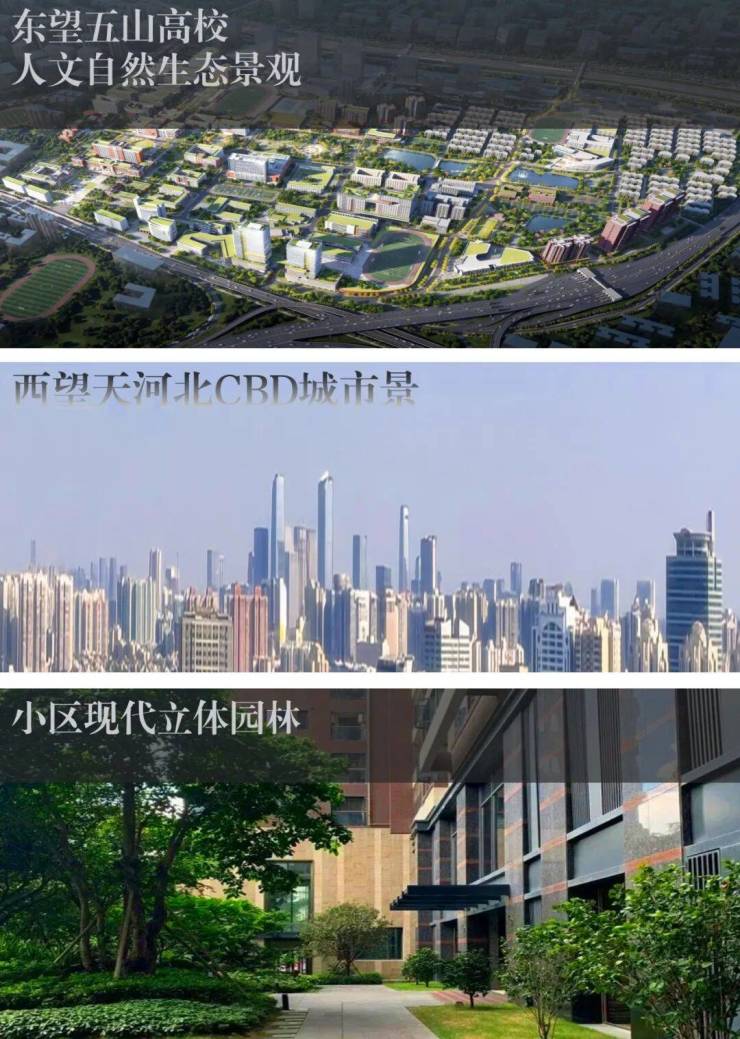 「项目所处于的东莞庄路,地势较高,形成半山景观」,东望五山高校人文自然生态景观,西望天河北CBD城市景观,高层视野开阔,低层可望小区现代立体园林;