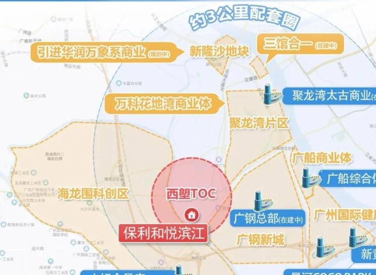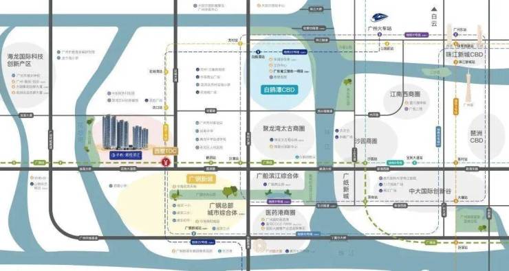 往大了说,处于白鹅湾商圈辐射区;往小了说,位于广钢新城板块西侧,周边是海龙科创起步区,坐落于西塱TOC辐射范围内。