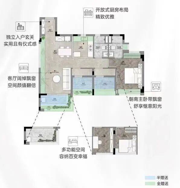 建面约84㎡三房,升级为南向四面宽!客厅、阳台、两大灵动空间、主卧,通通朝南,做出了100平的感觉。