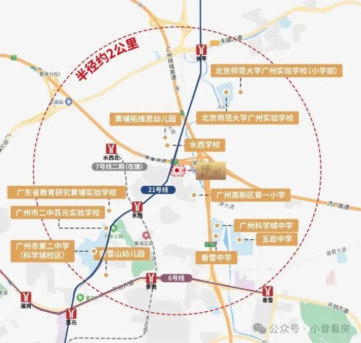 从本项目出发,约1.8公里即达重点中学——广州市二中苏元实验学校,约4公里可到北京师范大学广州实验学校;周边还有玉岩中学、科学城中学、玉山学校、水西学校、广州市科峻小学等学府环绕。
