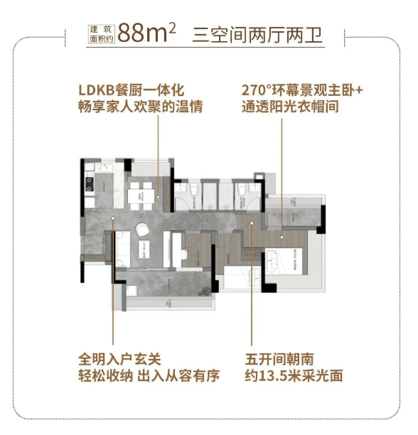 建面约88m三居,新规早收楼产品,告别等待成本,入住先人一步。