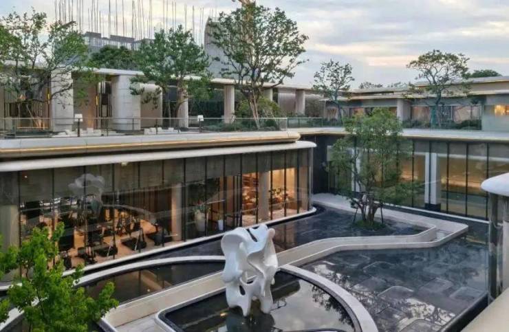 下沉式立体会所宛如水上浮岛,分设 “两馆三心”,为业主营造居家度假、运动健身、休闲娱乐、会客社交的多元化空间。此外,项目还将小区西侧的城市公园视野引入社区,打造内院、外园的无界绿色景观。