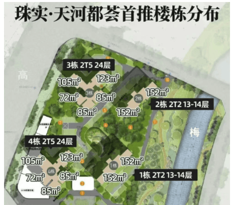 在寸土寸金的天河,高密度住宅早已成为常态。而珠江天河都荟却反其道而行之——项目整体容积率仅为2.0,是区域内极为少见的低密社区。首推北地块共4栋住宅,包含两栋13-14层的小高层(2梯2户)与两栋24层的高层(2梯5户),总户数仅284套,楼间距开阔,居住舒适度显著优于周边竞品。