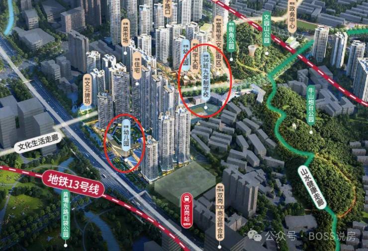 而未来方洲这个组团在所有组团中有着天然的优势,12班的幼儿园在校区里面,36班的九年一贯制学校就在北面,在家门口就能从幼儿园到初中,实现12年教育;